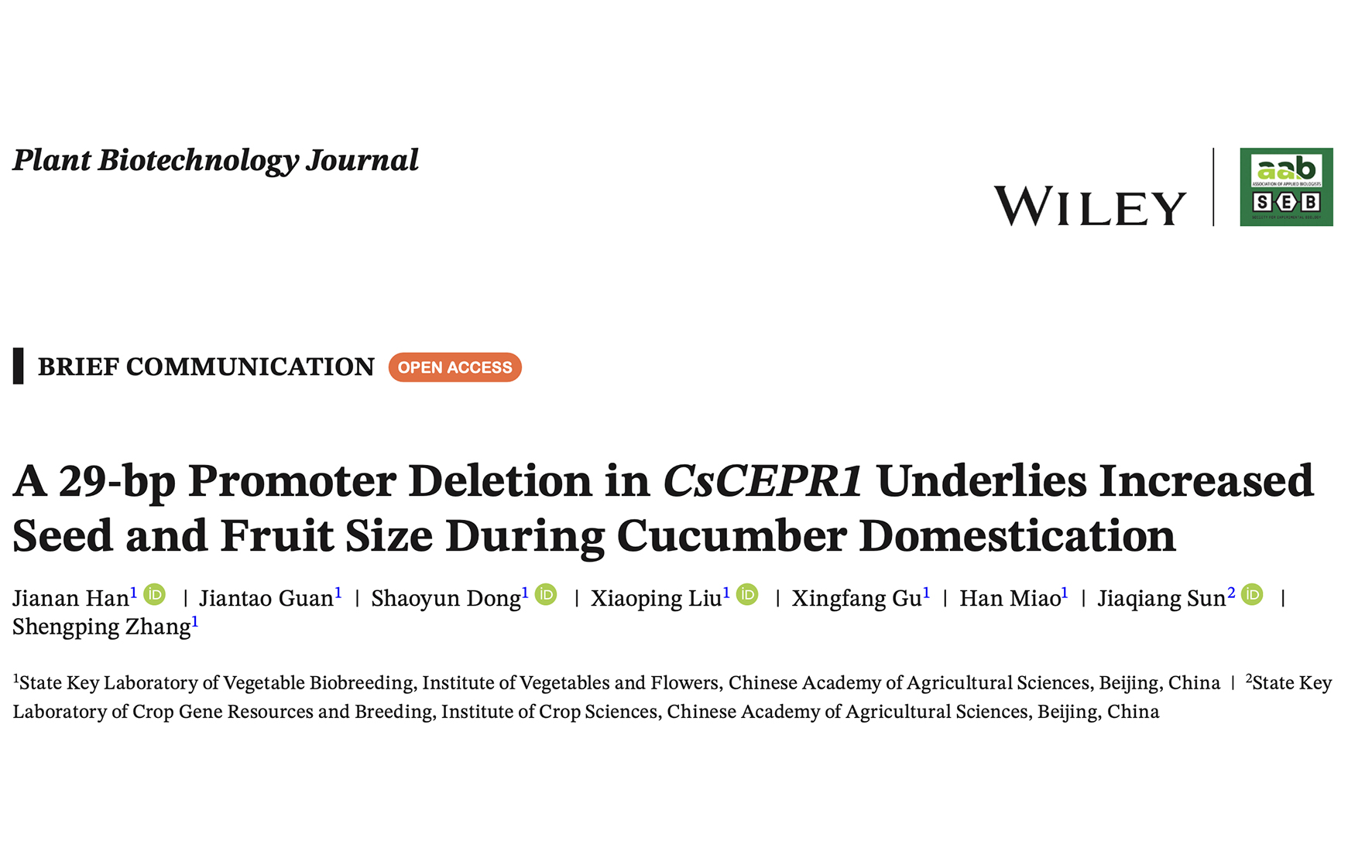 BPJ|Zhang Shengping’s Team revealed CsCEPR1 coordinately regulating the domestication of seed and fruit size in cucumber